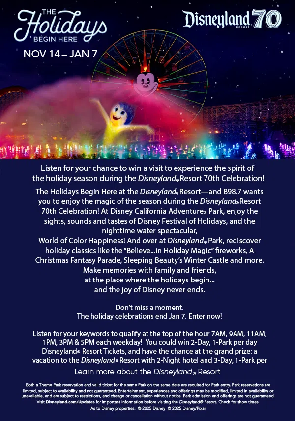 The holidays kick off November 14th at the Disneyland Resort, and B98.7 wants to send YOU to celebrate the magic of the season during the Disneyland Resort 70th Celebration!